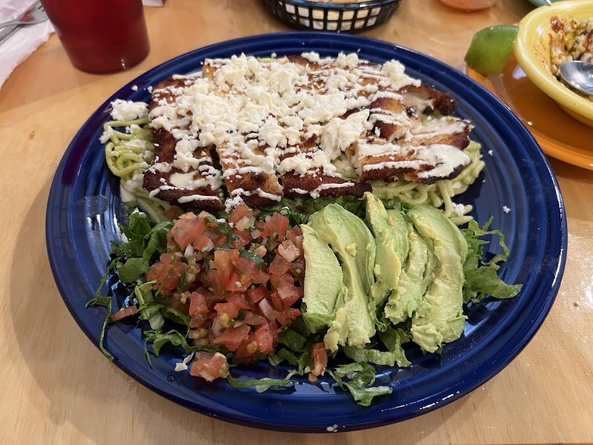 My husband and I were thrilled to learn this week that Besitos--one of Anniston's finest places for Mexican food--no longer closes in the afternoon. We tend to eat our major meal of the day around 3pm, and we have already eaten there twice in four days, now that we can. The first visit, I had a delicious Fajita Taco Salad with steak, succulent yellow bell peppers, and a perfect cheese sauce. My husband had a trio of chicken enchiladas in delicious corn tortillas with a fried egg on top (a signature of Besitos on several dishes). He got luscious charro beans as a side. Unfortunately, we lost that photo, but it was gorgeous. Their regular salsa is more generous with the cumin than most places, and that makes it addictive. They have thin chips! Today we went back to sample their new dish called Milanesa--launched as part of Downtown Anniston's Restaurant Week. They plan to keep it on the menu, but just in case, get yours now. It's a breast of chicken, butterflied with light breading, and pan-fried--smothered with garden fresh vegetables (tomatoes, mushrooms, grilled onions, and peppers) and melted cheese. You get a side of Mexican street corn OFF the cob, with fresh lime to give it the most wonderful tang. And they add avocado slices to a salad with romaine lettuce. And there is a mouth-watering tomatilla salsa for most of us, and for those who like the spicy heat, ask for the jalapeno salsa. The chicken entree is huge. We came home with enough for another full meal. So believe me, its $17 price tag is a bargain. The food, all by itself, is a reason to go downtown and find this place, but let me tell you what else I love about it. It's family-owned, with the owner doing the cooking. His recipes are from his grandmother, mother, and his own experiments with what delights people. He drives two hours every day to get the finest produce, and you taste it. But here's what renders Besitos worthy of our business even more: They have rescued one of our historic downtown spaces, becoming part of our celebrated downtown revitalization. For all who are driving down I-20, wondering where you want to eat, YES, it's worth the four miles up Quintard Boulevard, and a few blocks over to Noble Street. This is the heart of an old city with lovely new uses. There's parking on the street in front and plenty in the back. This isn't beans-mushed-up-with-lard Mexican food. It's what a Mexican grandmother would serve her family.
